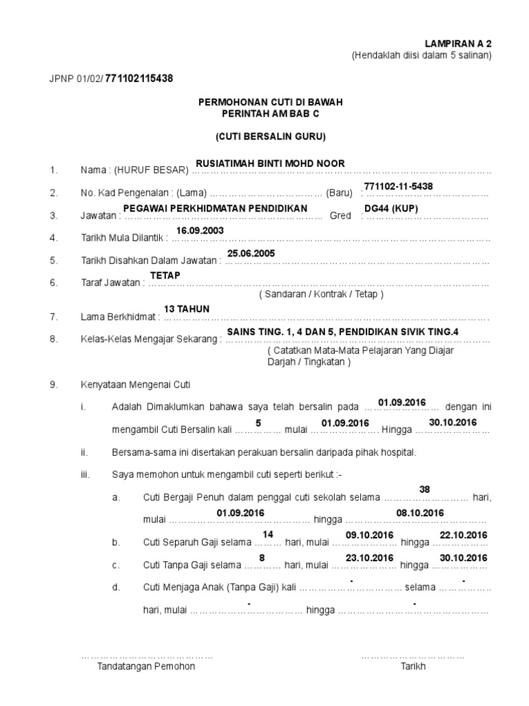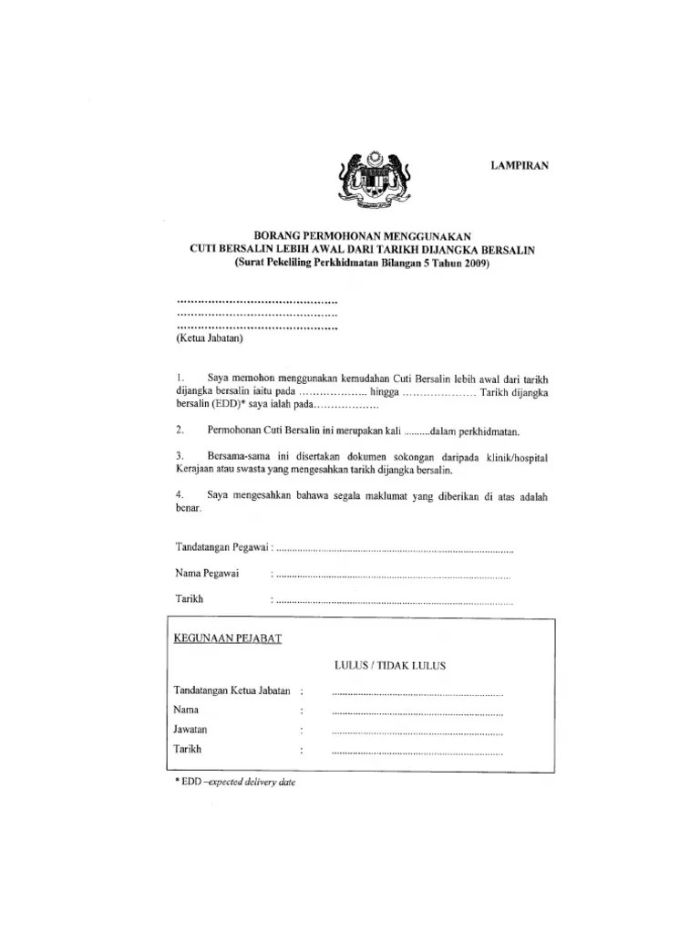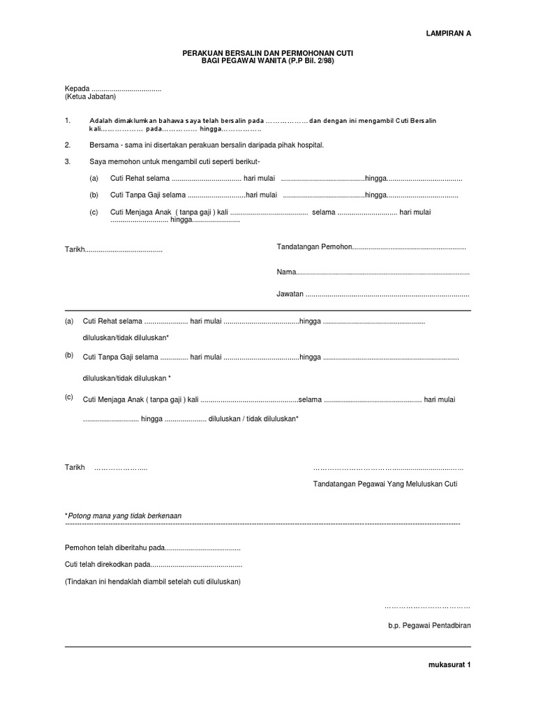 Di sesetengah tempat, cuti bersalin boleh dikongsi oleh suami isteri. Daripada cuti bersalin dan telah tiada baki cuti bersalin. Turutan kemudahan cuti bersalin yang dipohon. Kemudahan cuti bersalin tanpa gaji yang diambil tidak menjejaskan kemudahan cuti tanpa gaji sepertimana yang diperuntukkan dalam perenggan 54.4 pekeliling lampiran a pihak berkuasa melantik / menamatkan pegawai kontrak. Saya bersetuju terhadap semua maklumat yang diberikan dan bertanggungjawab sepenuhnya terhadap semua urusan, pelantikan, peruntukan kewangan bagi emolumen kakitangan ini serta peraturan dan arahan perkhidmatan penama sebagai.