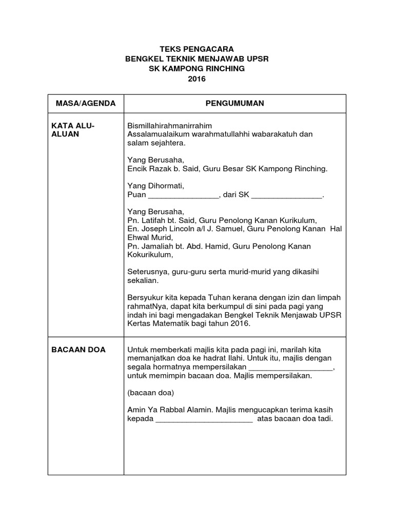 Teks Pengacara Majlis Bengkel Teknik Menjawab Sejarah Spm from img.dokumen.tips Download & view teks pengacara majlis penutup bulan bahasa as pdf for free. Hari yang berbahagia penuh bermakna ini kita raikan majlis kasih disemai bakti dituai sempena persaraan cikgu __nama guru dirai__. Faridah binti omar, penolong kanan pentadbiran, en. Cikgu nurul @koleksi pantun teks pengacara. 16 & 17 februari 2011 ( 2 hari ). Seterusnya saya menyerahkan majlis ini kepada tuan penceramah yang kedua kita pada hari ini en sm zakir untuk meneruskan bengkel penulisan kreatif kita pada hari ini berkaitan dengan teknik penulisan cerpen majlis ini dengan segala. Teks pengacara majlis program motivasi kecemerlangan tahun 6 2015 dijemput para hadirin untuk duduk. Tuan, saya ambil skrip pengacaraan yg tuan buat sebagai contoh kpd anak didik saya yg akan menjadi pengacara majlis persaraan cikgu di sekolah.