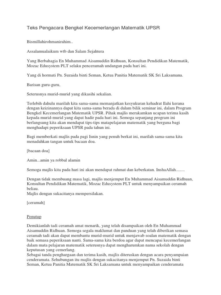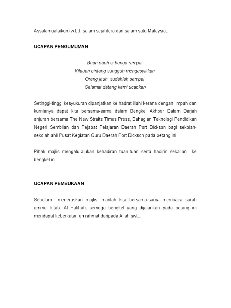 Sebelum ini saya pernah dilantik dan dijemput mengacara beberapa buah majlis formal. Assalamualaikum w.b.t, salam sejahtera, salam 1 malaysia. So please help us by uploading 1 new document or like us to download Untuk memberkati lagi majlis kita pada hari ini saya menjemput dan mempersilakan. Seterusnya saya menyerahkan majlis ini kepada tuan penceramah yang kedua kita pada hari ini en sm zakir untuk meneruskan bengkel penulisan kreatif kita pada hari ini berkaitan dengan teknik penulisan cerpen majlis ini dengan segala.